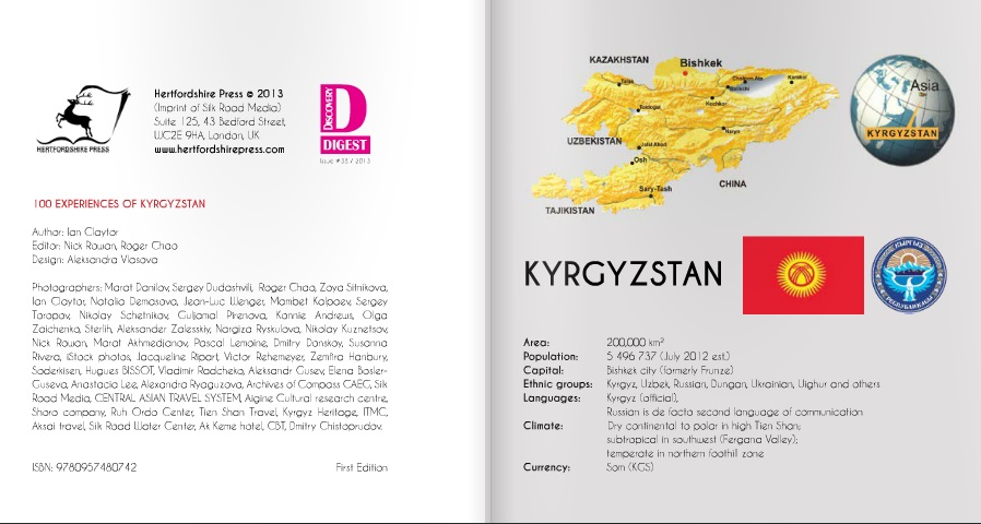 The journalist however, Certainly Summed up how I felt about the country when I first arrived (tor o 10 day holiday), bock in 1994. At that time it was very difficult to find out anything about this once remote corner of Central Asia - one of the smal landlocked states to emerge from the former Soviet Union that lies in the heart of the Eurasian continent and once straddled the Cleat Silk Rood. Obviously, in school hod learned about the Great Sdk Rood, and about historical characters such as Cenghis Khan and Torrerlone but I had, really. no idea of what to expect as I descended steps from the oirplane. I would have untamed o magazine such as Discovery Kyrgyzston to open a window onto this country of contrasts: its variety of landscapes and wildlife, peoples and cultures history and traditions. Kyrgyzsten is a land of contrasts Even though it is only o small country, within its borders there are o multitude of spectacular landscapes: on abundance of wildlife - much of it very rare and endangered; o multi-ethnic population representing Over 80 different nationalities each preserving their only culture, traditions and cuisine - primarily, of Course, the rornad.c Kyrgyz; numerous sites of historical interest and importance and a range of possible activities from maintoincering, trekking, rafting, skiing. or even just sitting on a beach, relaxing in the sunshiny. In short there is something for everyone.